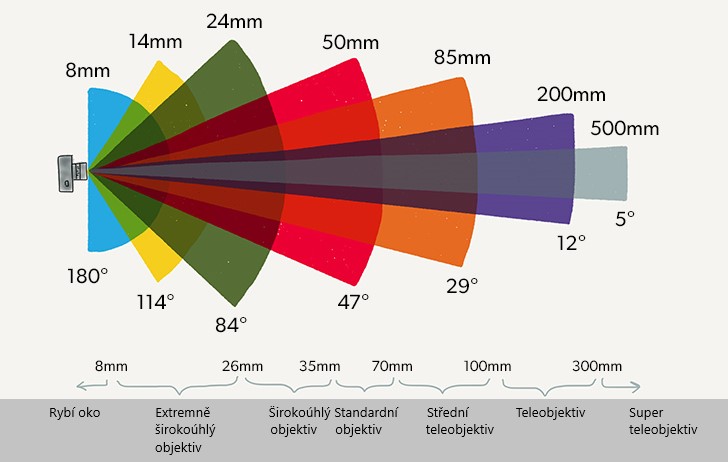 Graf znázorňuje úhel záběru různých objektivů fotoaparátů. Širokoúhlé objektivy (8-24mm) mají širší úhel záběru, zatímco teleobjektivy (70-500mm) poskytují užší záběr. Standardní objektiv (50mm) nabízí přirozený úhel pohledu.
