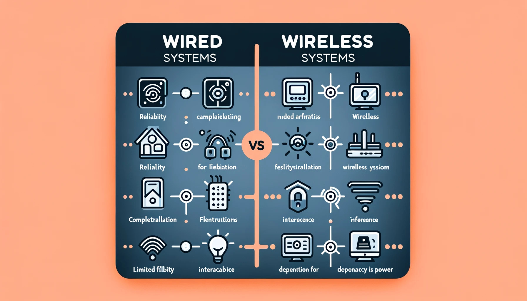 Bezdrátové systémy nabízí flexibilitu a snadnou instalaci bez nutnosti kabeláže, což je činí vhodnými pro dočasné nebo mobilní použití a pro objekty, kde není možné vést dráty. Jsou také snadno rozšiřitelné. Nicméně mohou být náchylnější k rušení signálu a vyžadují pravidelnou výměnu baterií. Obecně platí, že výběr mezi drátovým a bezdrátovým systémem závisí na konkrétních potřebách, možnostech instalace a preferencích uživatele.