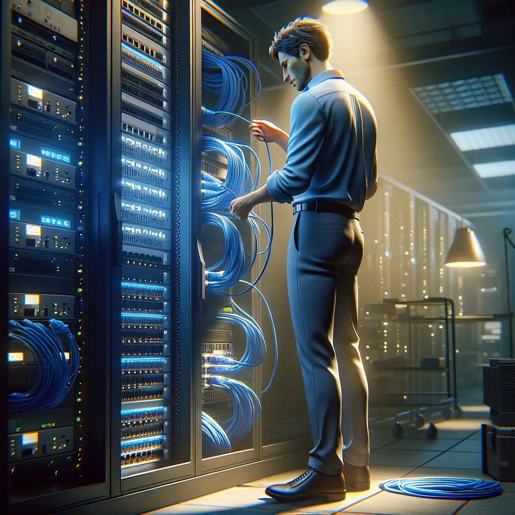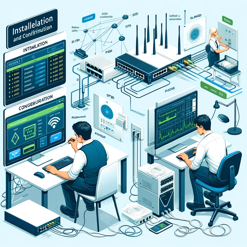 - Fyzická Instalace: Umístění routeru a switchů pro optimální pokrytí signálem a připojení kabelů.